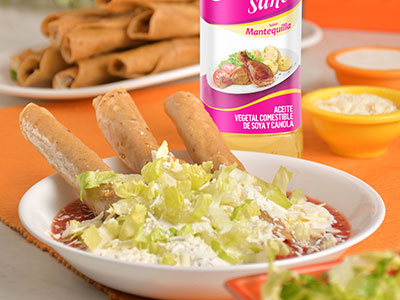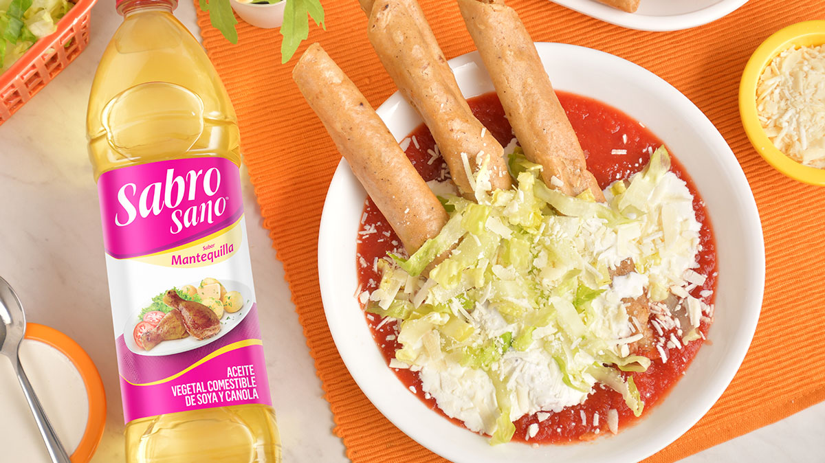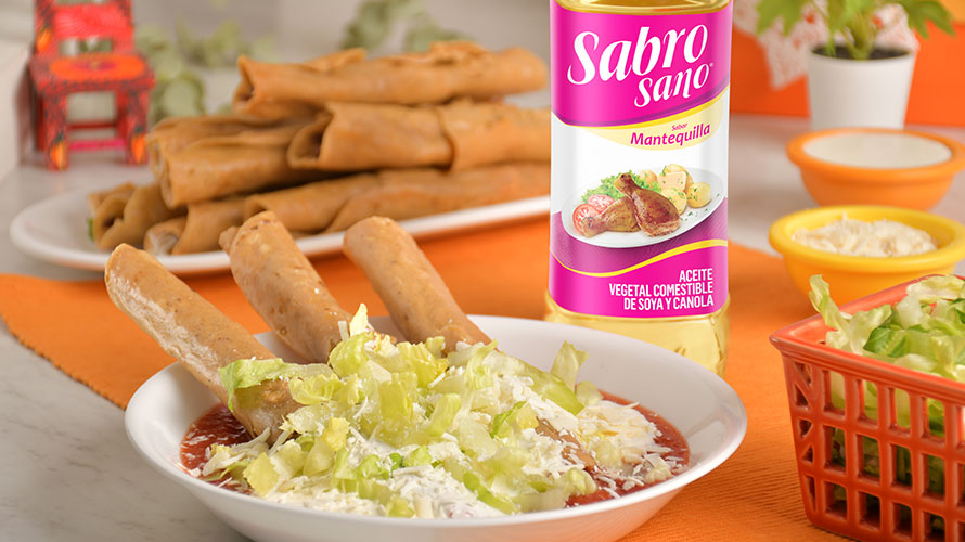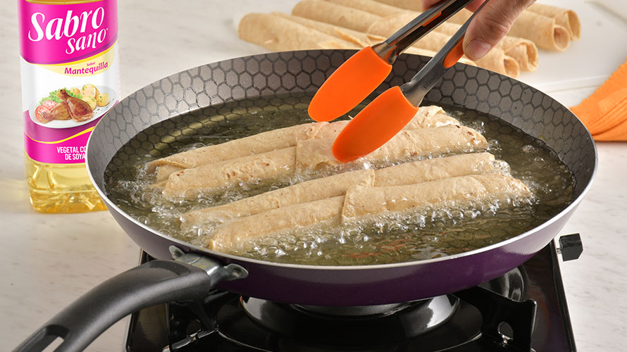 En una tortilla coloca el relleno de la carne deshebrada y enrolla. Calienta el aceite Sabrosano Mantequilla en una sartén y fríe los tacos hasta quedar dorados y crujientes.