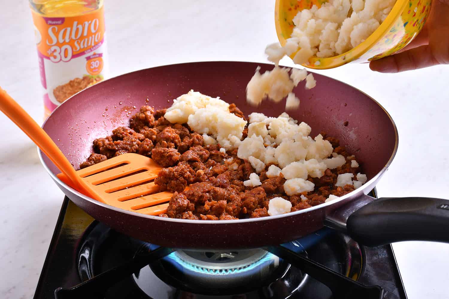 – Para que no quede muy seco puedes agregar media taza de crema. Procura mantener caliente este relleno a fuego bajo.