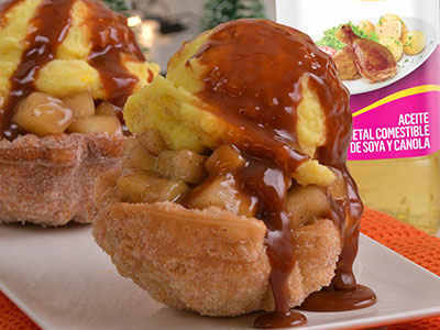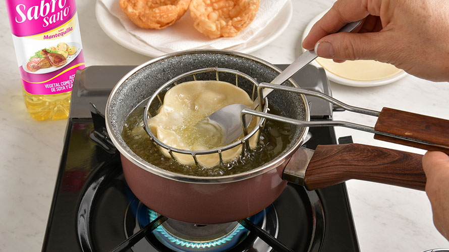 En una sartén agrega Aceite Sabrosano Mantequilla y fríe los discos de empanada para formar una canasta con la ayuda de un utensilio de cocina. Cuando estén dorados retira del aceite y escurre.