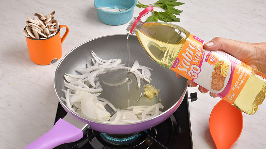 En una sartén calienta el aceite Sabrosano Mantequilla, fríe la cebolla y el ajo, añade los hongos y el epazote, sazona con sal y pimienta, retira del fuego y reserva.
