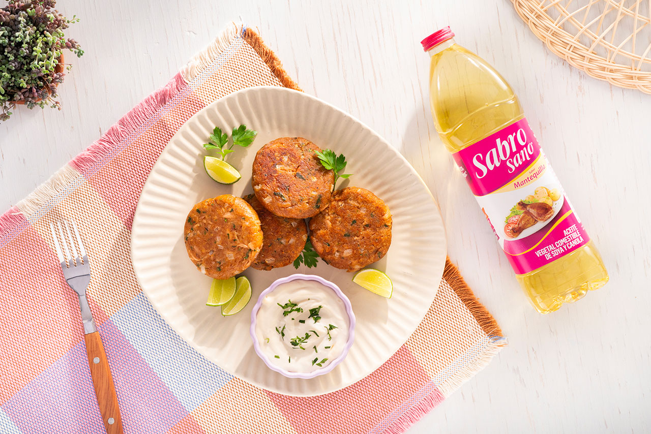 Prepara estas tortitas de atún con queso mozzarella, crujientes por fuera y suaves por dentro, usando Aceite Sabrosano Mantequilla. Una opción práctica, sabrosa y perfecta para cualquier comida del día.